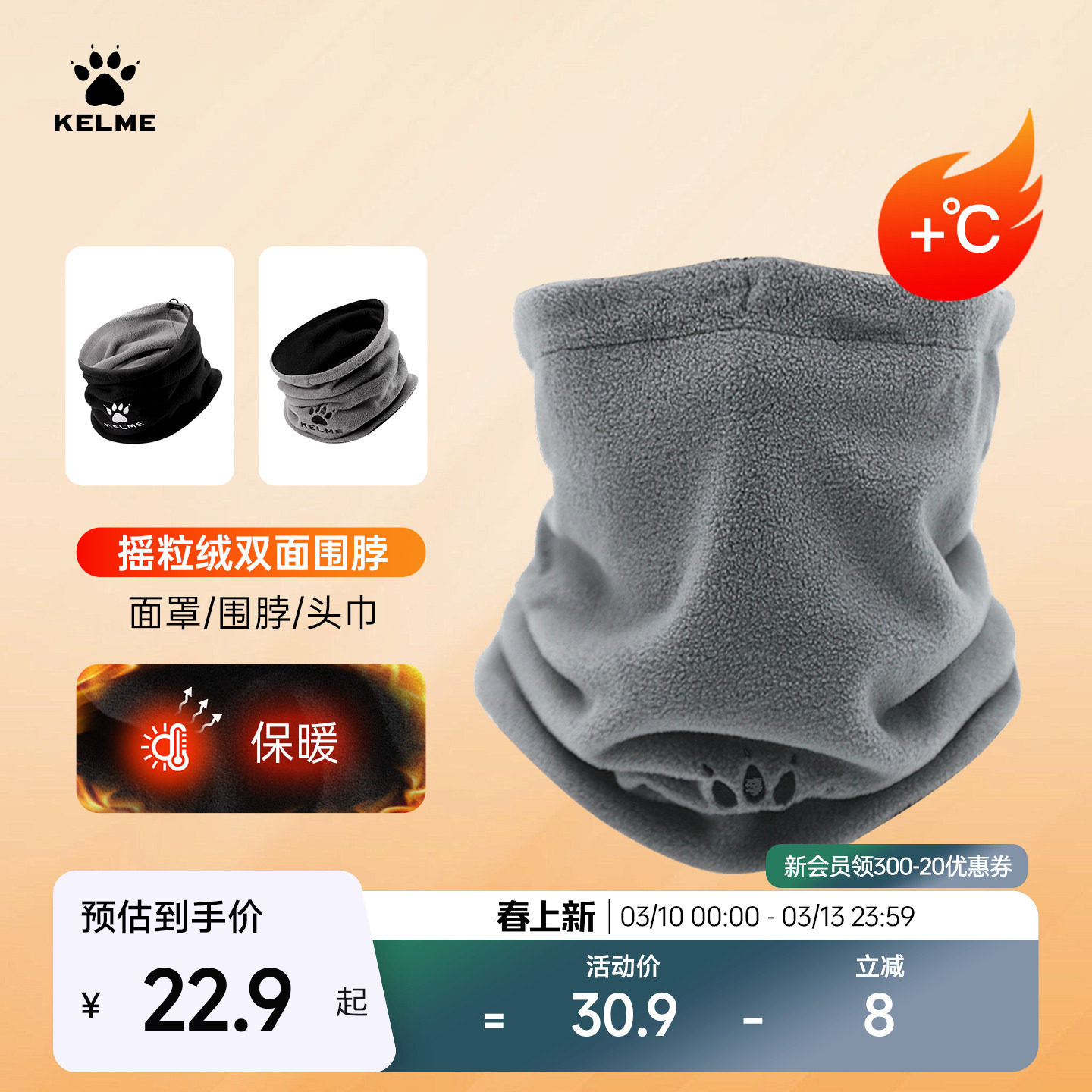 KELME卡尔美防寒双面抓绒运动围脖秋冬户外跑步足球训练保暖面罩