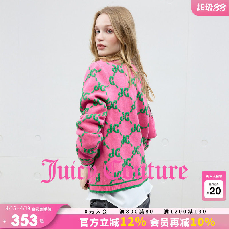 【含绵羊毛】Juicy Couture橘滋外套女玫红撞色提花休闲针织开衫