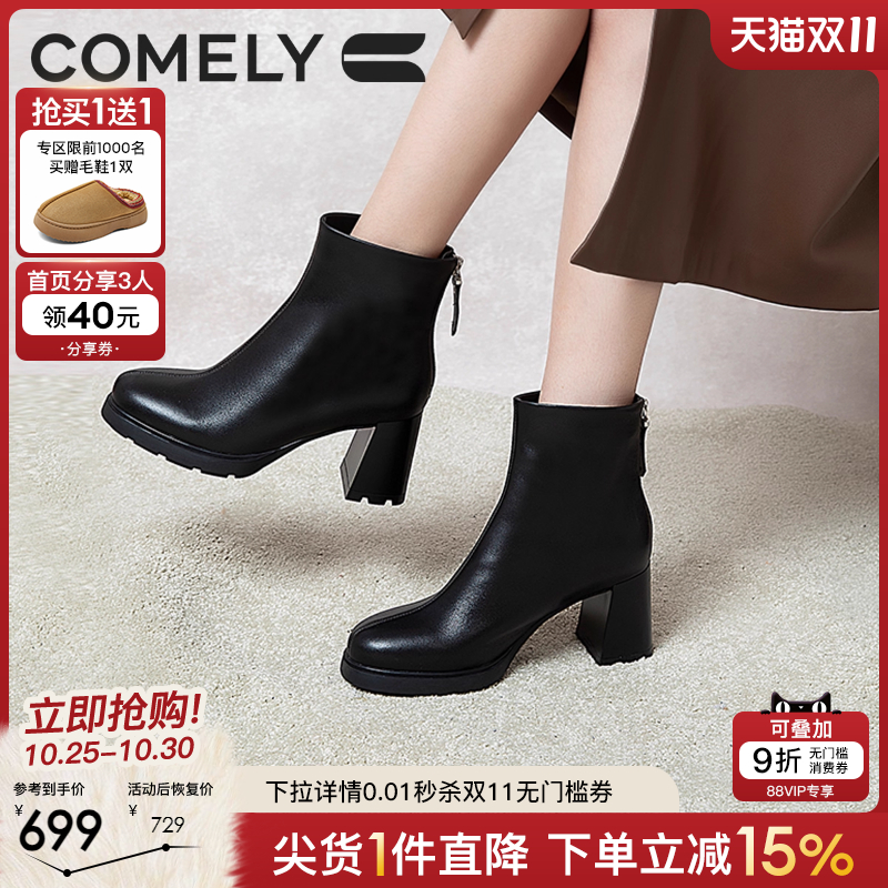 金利来女鞋2024秋冬新款休闲通勤圆头高跟短靴羊皮黑色粗跟时装靴