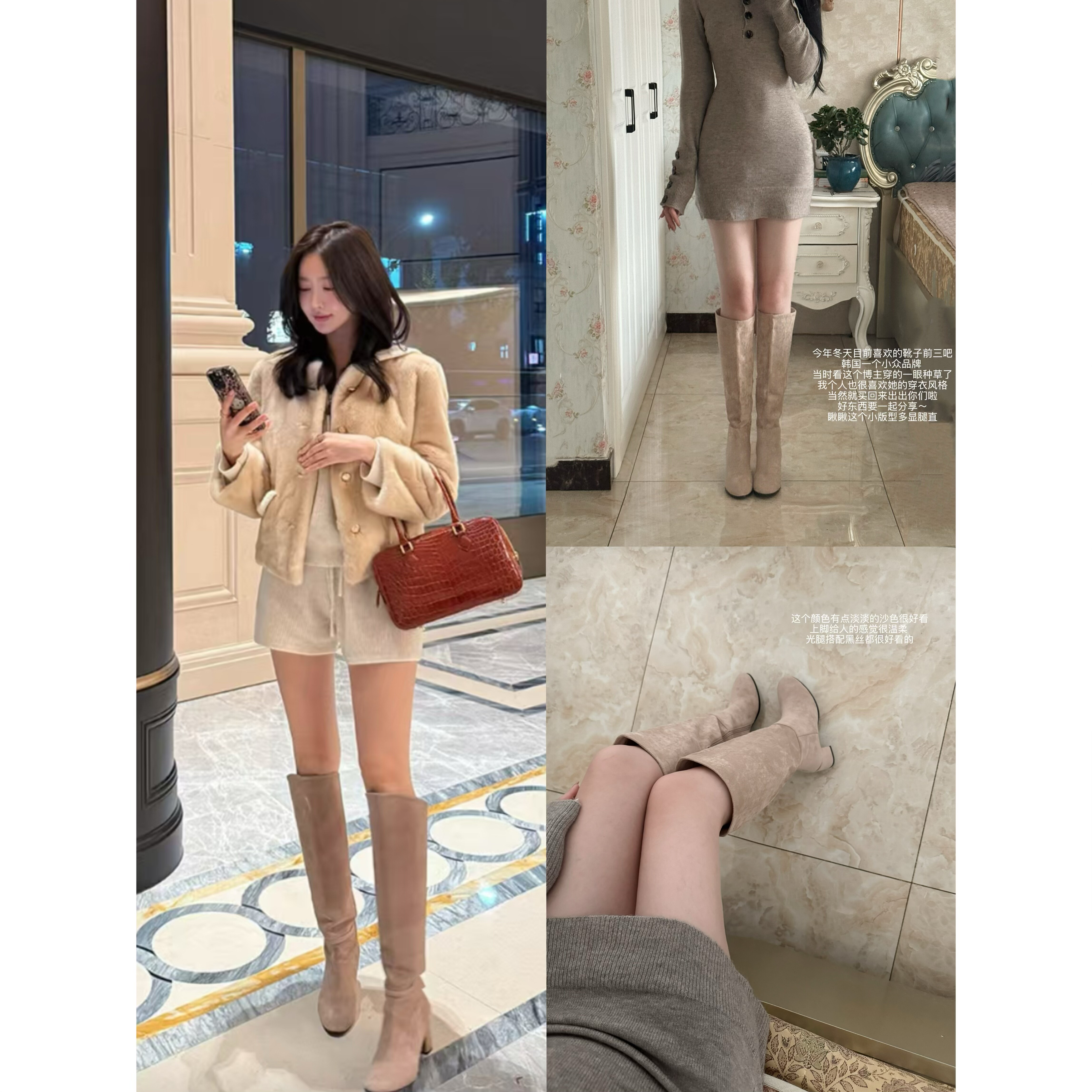 2025秋冬新款韩版圆头高跟高筒靴女真皮粗跟套筒不过膝长靴长筒靴