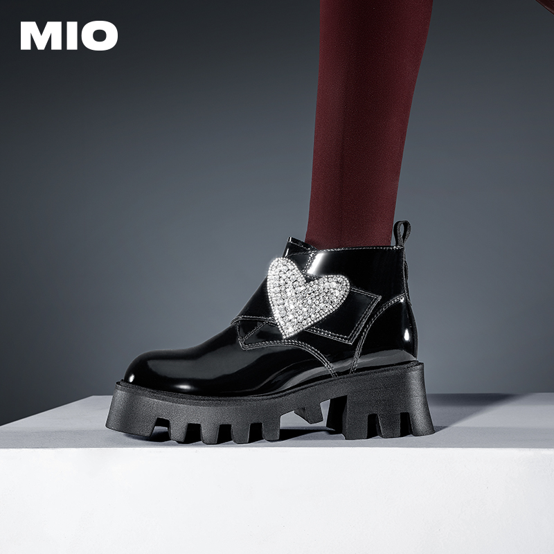 MIO米奥靴子冬季圆头高跟短筒靴爱心钻饰潮酷厚底时装靴保暖女靴