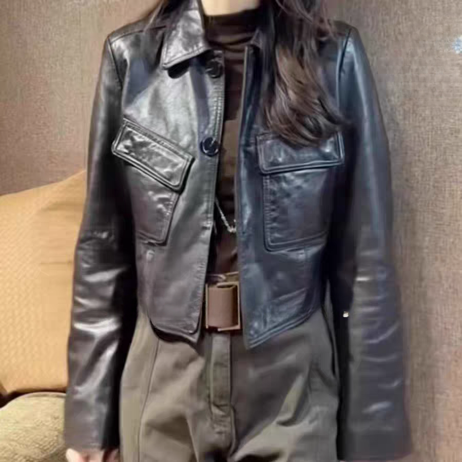 时尚新款真皮皮衣女款短款百搭修身休闲单排扣翻领皮夹克长袖外套