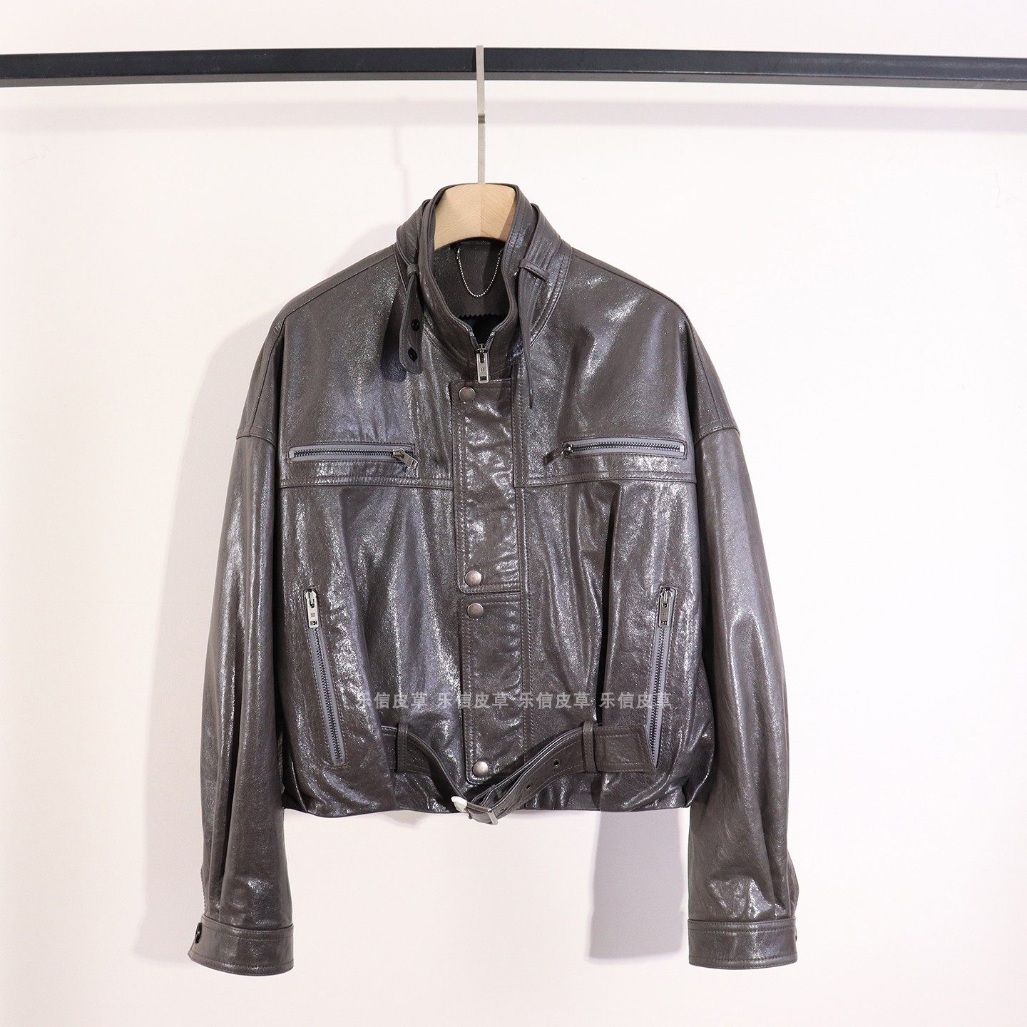 修身皮衣女款2025年秋季新款绵羊皮长袖皮夹克真皮烟灰色长袖外套