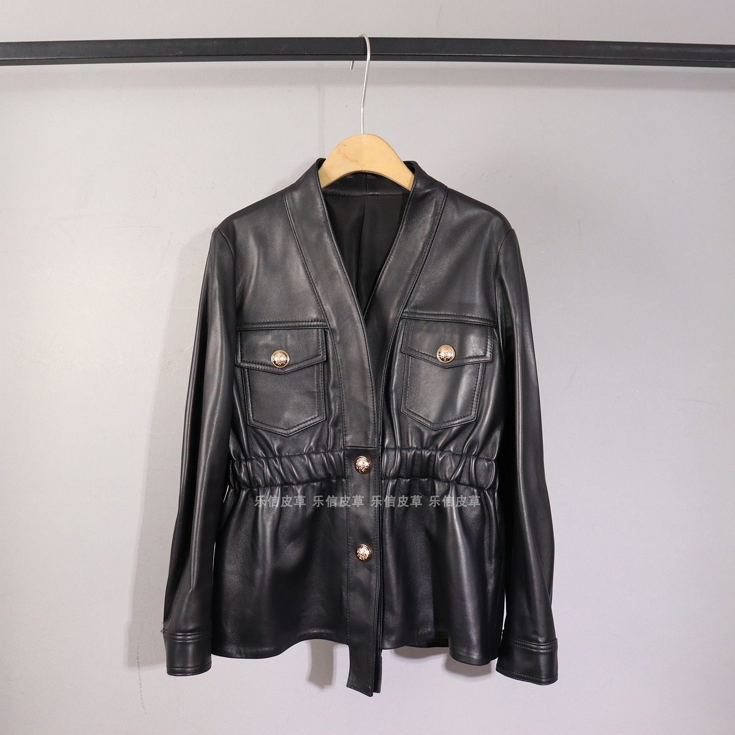 修身皮衣女款2025年秋季新款绵羊皮V领夹克黑色上衣真皮显瘦外套
