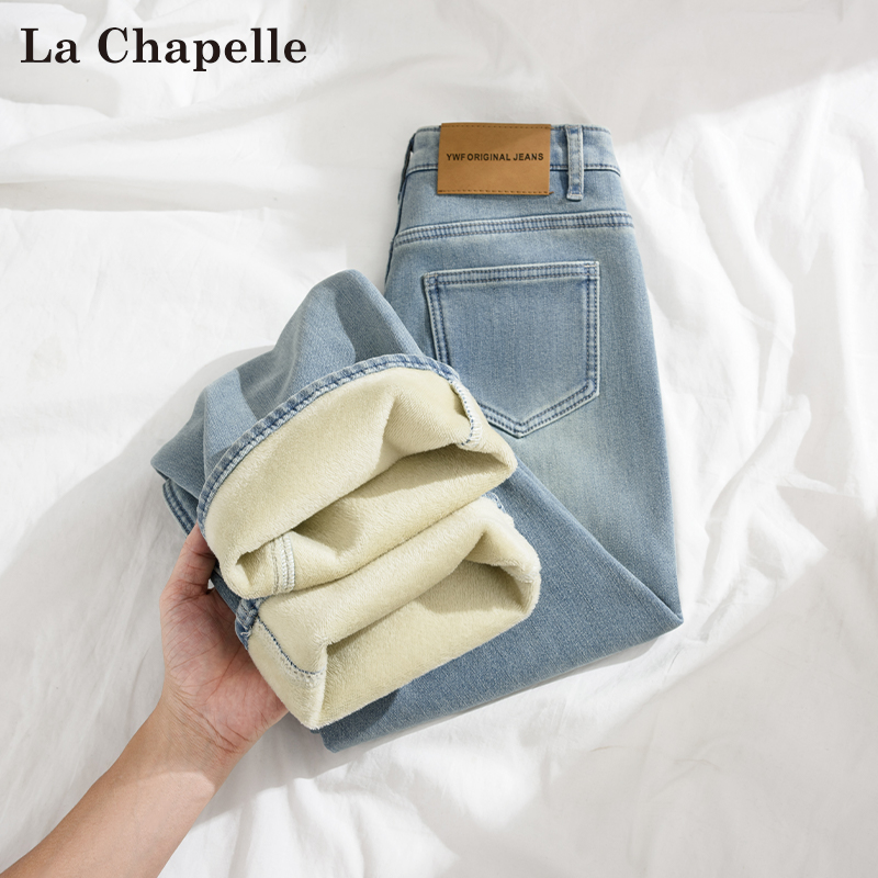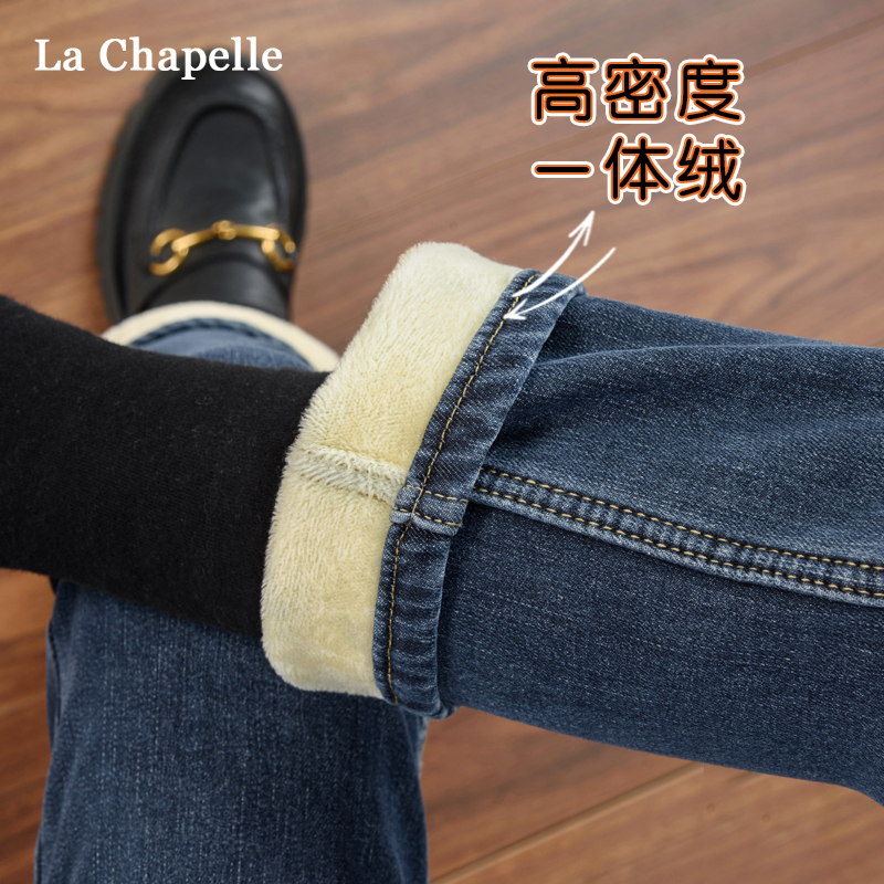 拉夏贝尔美式加绒直筒牛仔裤女秋冬新款高腰小个子一体绒烟管裤子