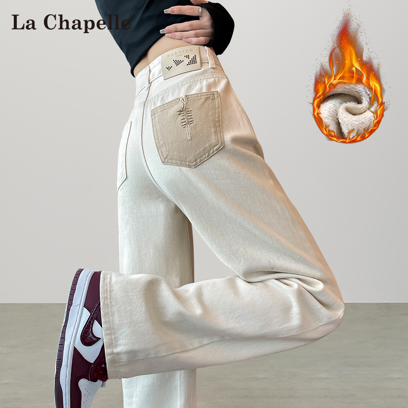 拉夏贝尔米白色加绒直筒牛仔裤女秋冬季高腰显瘦小个子窄版阔腿裤