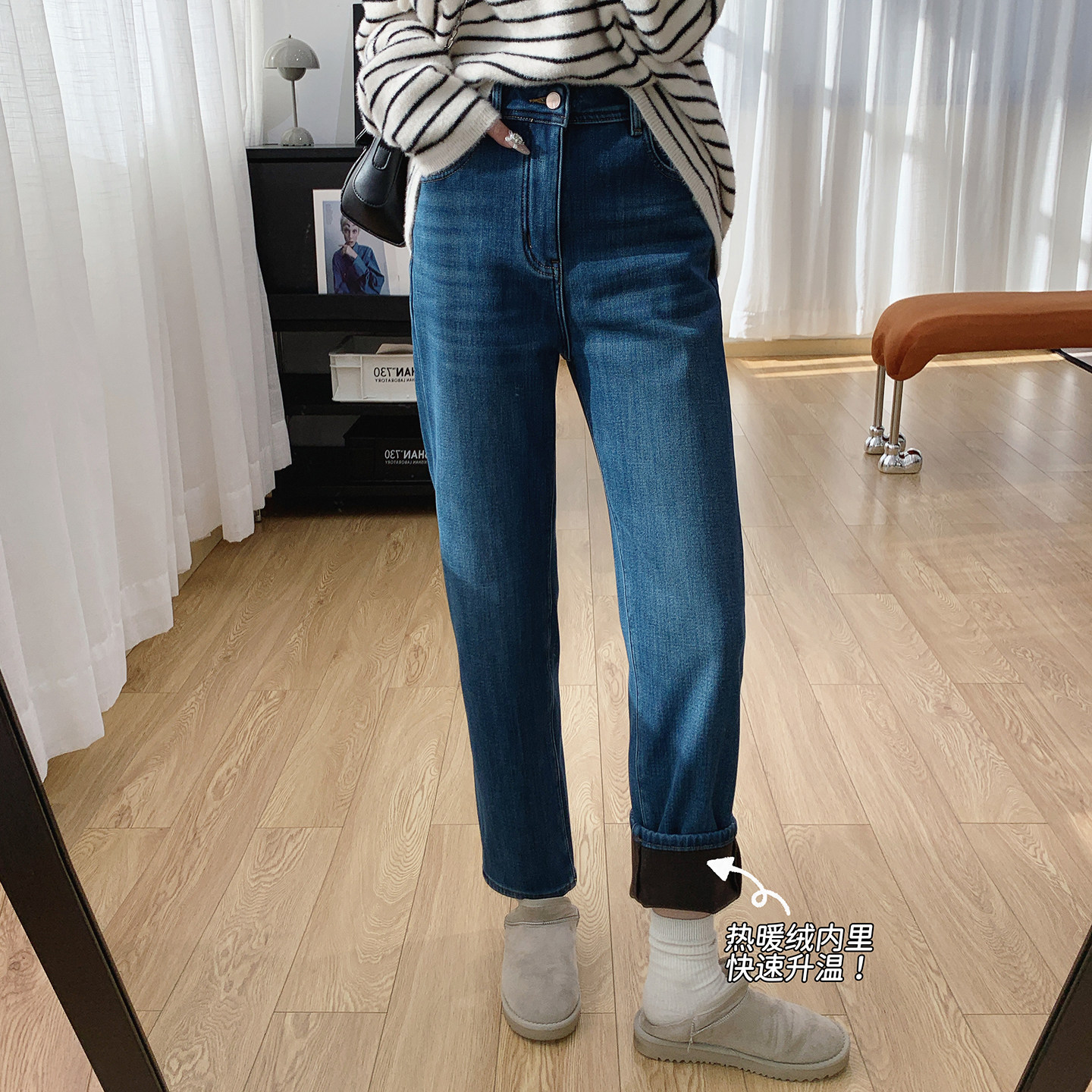 HAVVA窄版加绒直筒牛仔裤女视觉显瘦显腿长裤子2025冬季KH3-3808