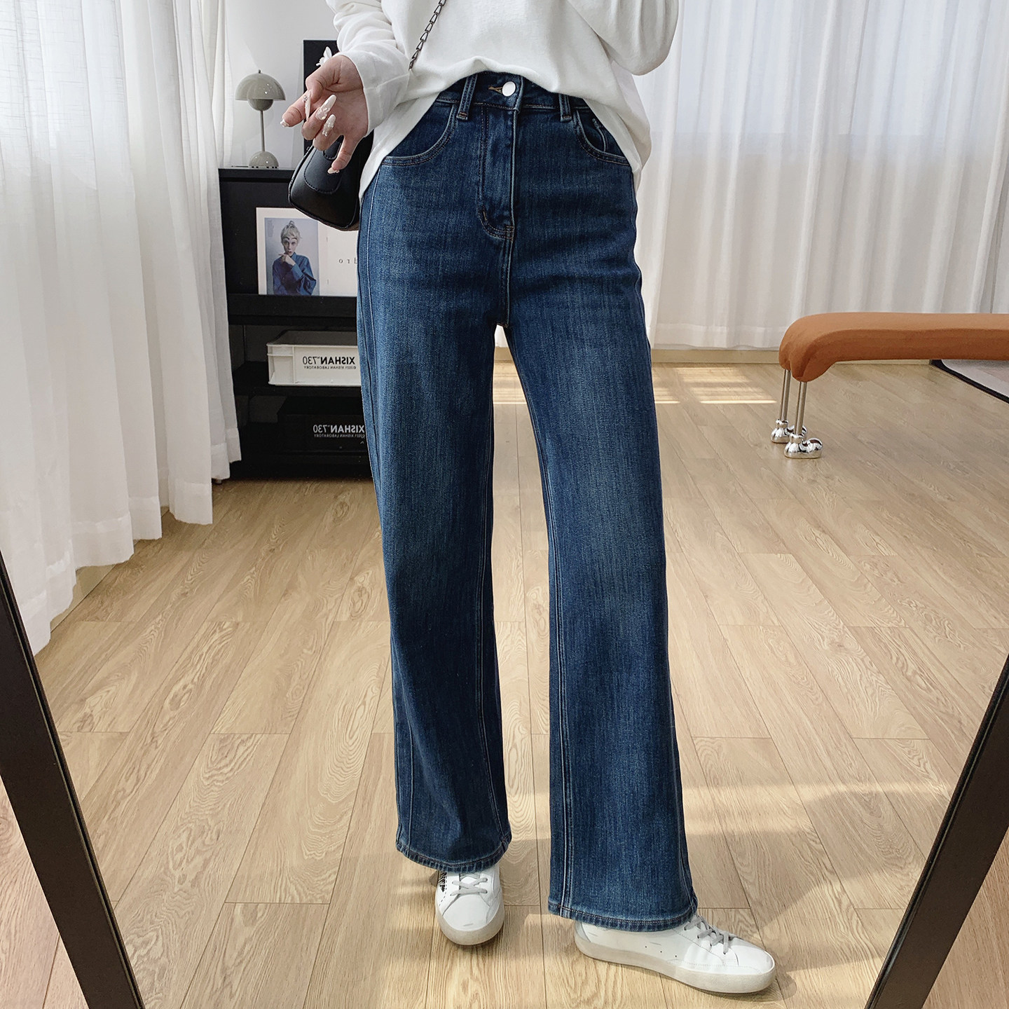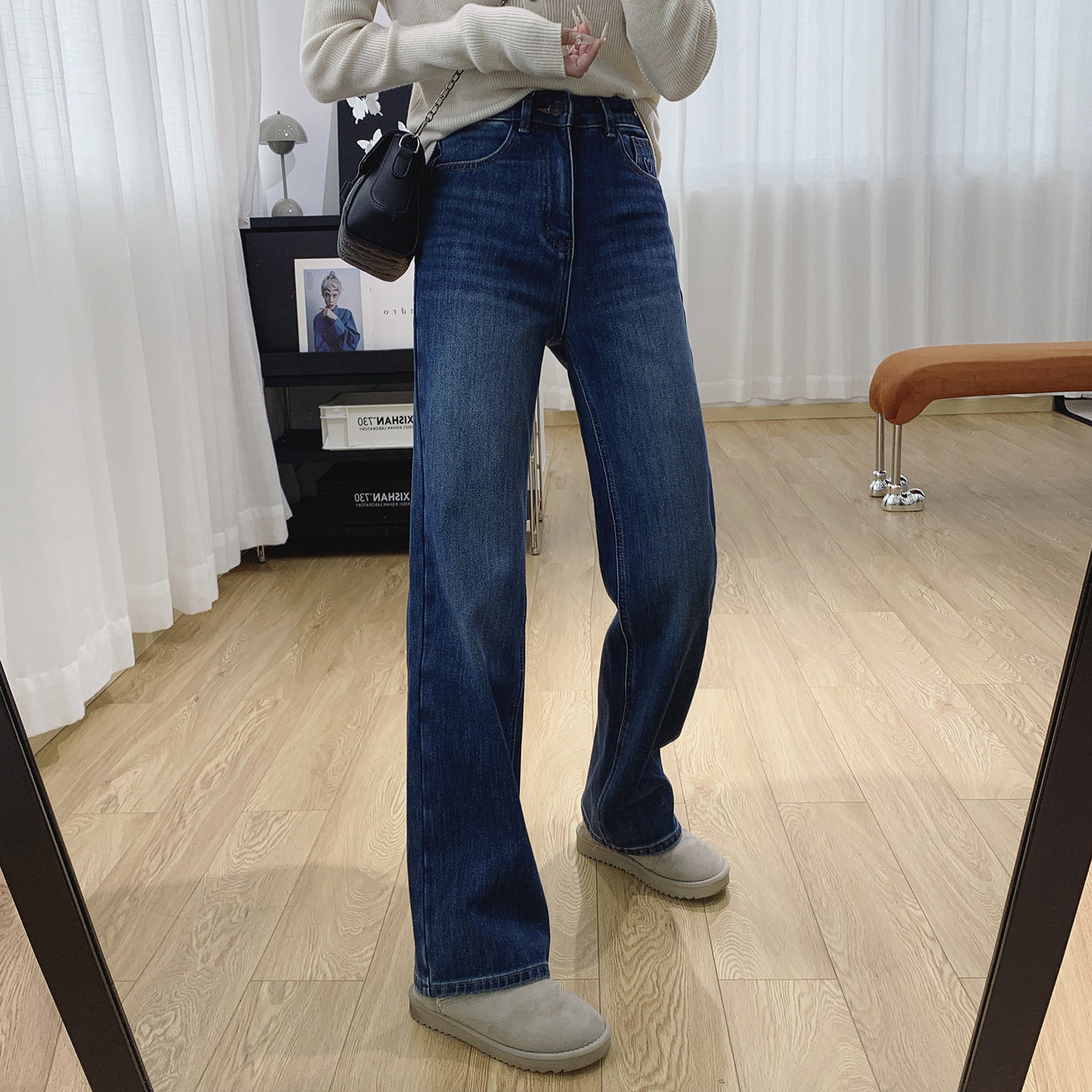 橘子树在哪儿蓝色加绒直筒牛仔裤女秋冬设计感高腰阔腿显瘦拖地裤
