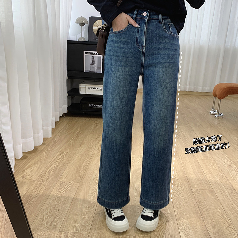 复古加绒直筒牛仔裤女秋冬加厚不臃肿宽松垂感显瘦爆款窄版阔腿裤