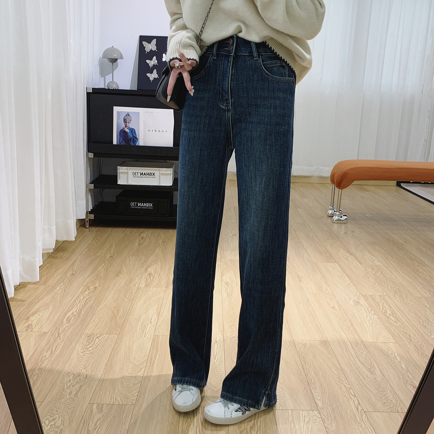 超好看开叉高腰显瘦加厚加绒直筒牛仔裤女冬季裤子宽松窄版阔腿裤