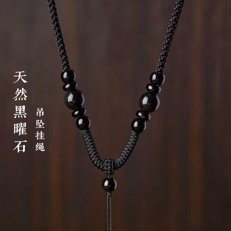 高档天然黑曜石吊坠挂绳手工编织三毫米粗男女可调节时尚配线绳子