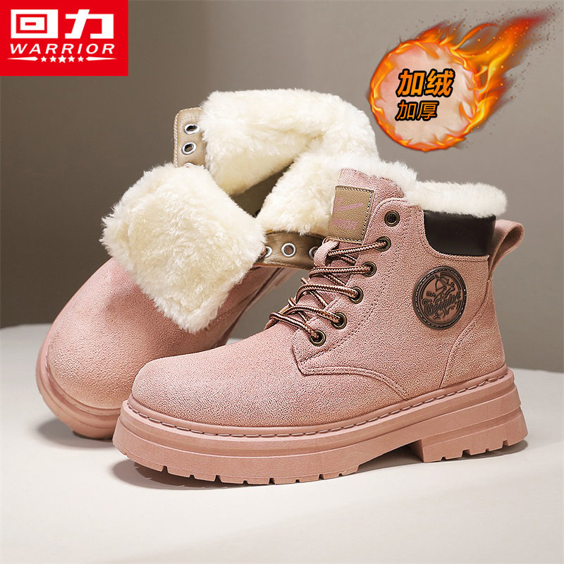 回力粉色马丁靴女2025新款冬季加绒加厚保暖棉鞋登山超火厚底短靴