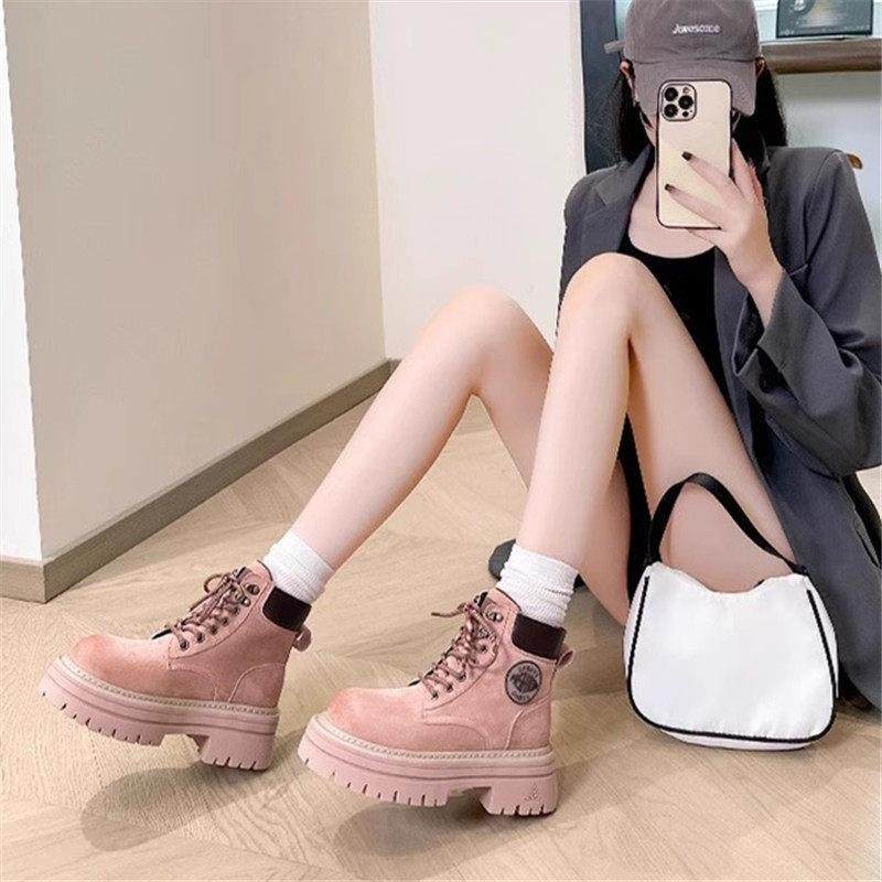 粉色马丁靴女大黄靴厚底爆款2024年早秋新款靴子真皮增高超火短靴