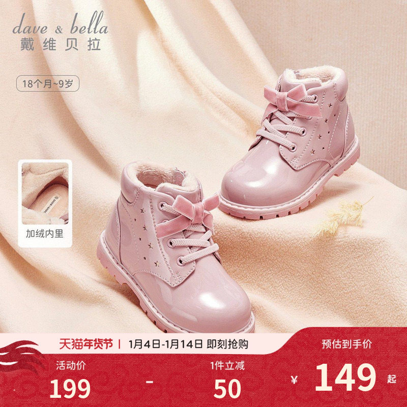 戴维贝拉女童靴子2026新款冬季粉色皮靴加绒皮鞋小童粉色马丁靴