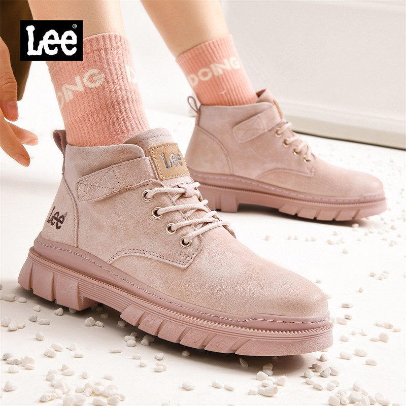 Lee官方真皮大黄靴女款马丁靴冬季英伦加绒短靴厚底粉色马丁靴女