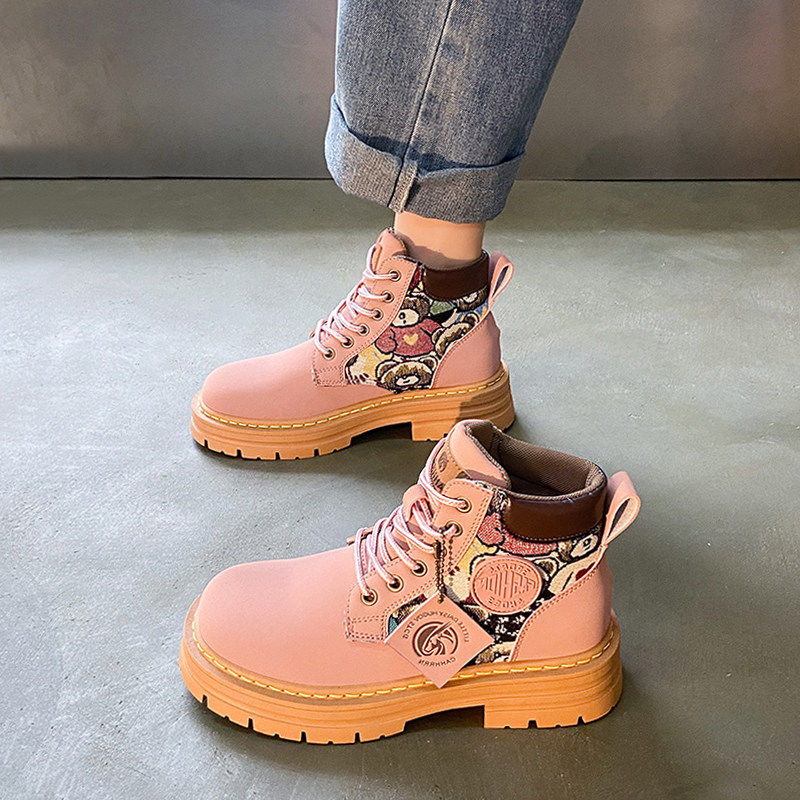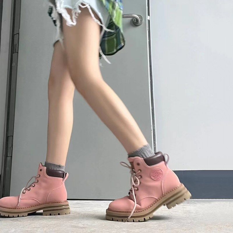 欧货潮鞋系带英伦风厚底马丁靴圆头平底韩版枚粉色短靴户外工装靴