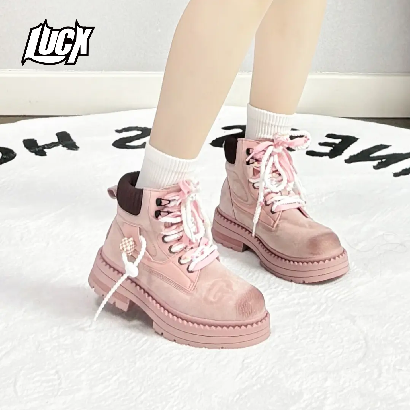 Lucx巨好看马丁靴冬季2025新款粉色女靴子厚底增高公主大头工装靴
