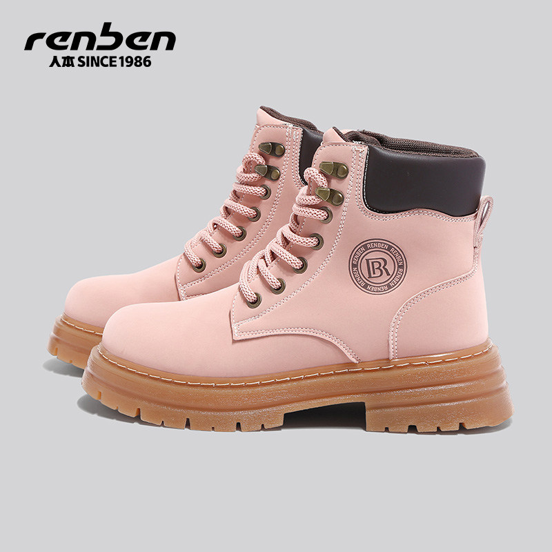 人本粉色马丁靴女款2025新款秋季复古工装超火女靴增高加厚短靴子