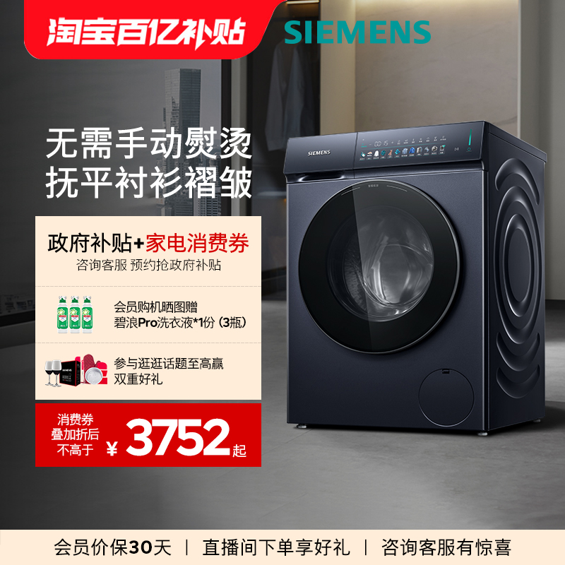 【小幸熨新品】西门子10公斤官方家用变频蒸汽除皱滚筒平嵌洗衣机
