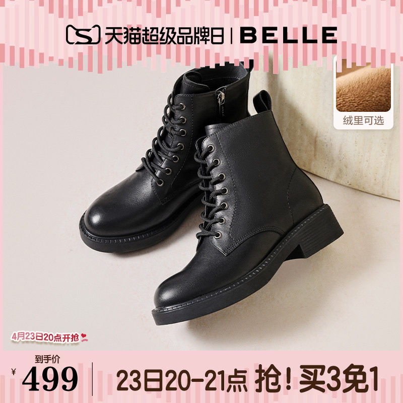 百丽女靴英伦风真皮马丁靴女保暖冬新时装靴厚底加绒短靴B9T1DDD4