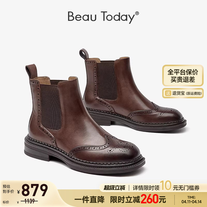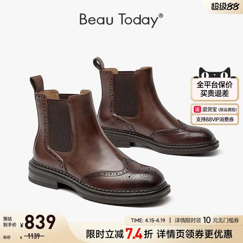 BeauToday厚底方头切尔西靴女款真皮复古英伦风马丁靴短靴子女靴