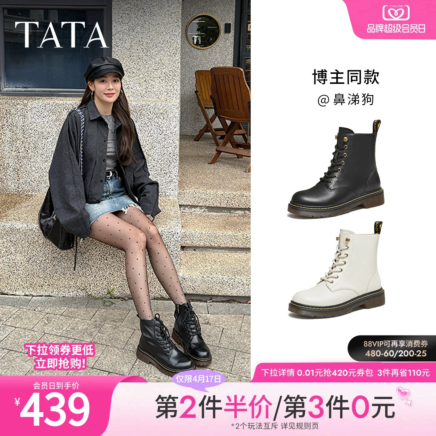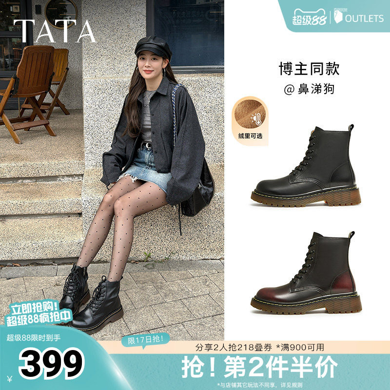 Tata他她靴子经典英伦风复古加绒马丁靴厚底女靴真皮短靴WUY02DZ4