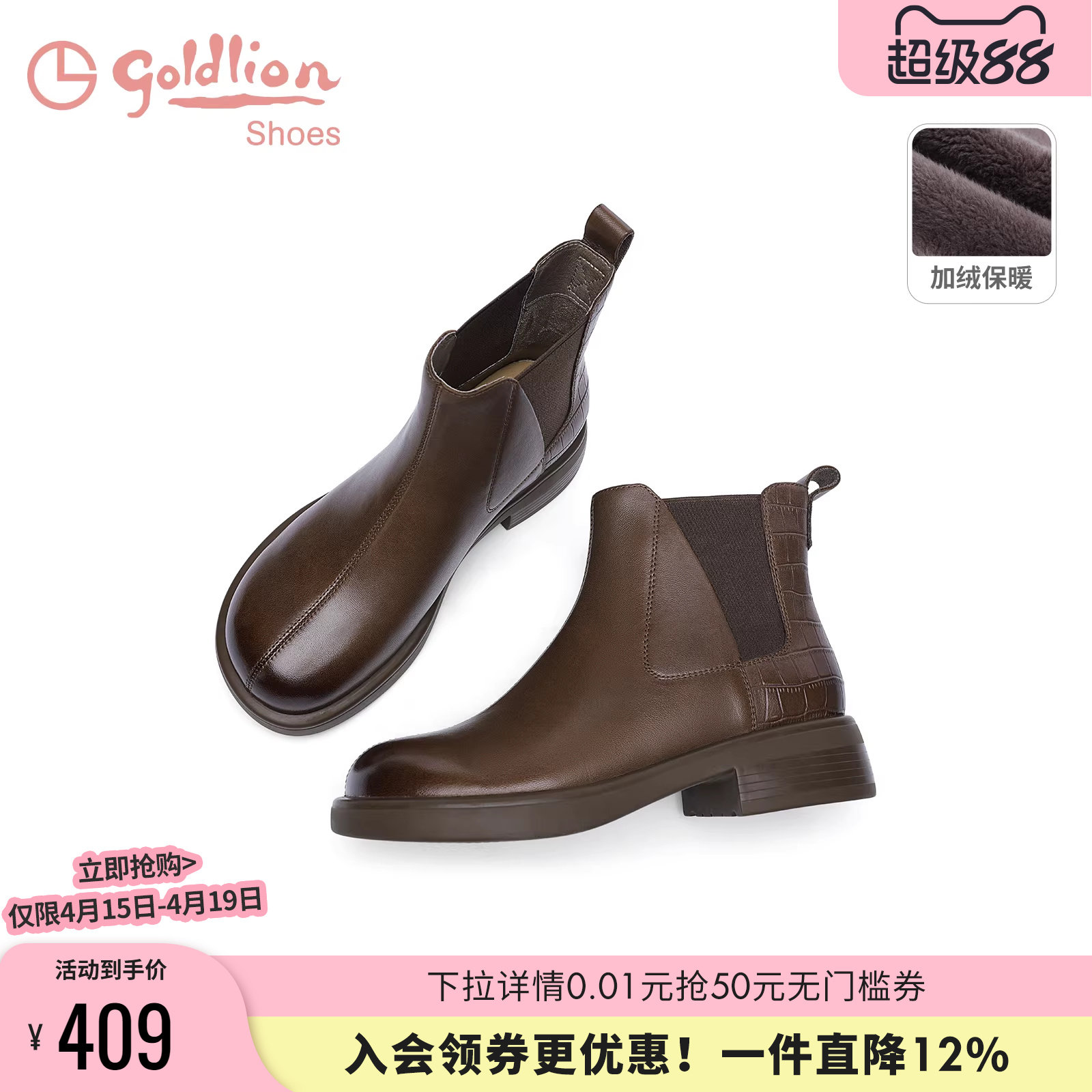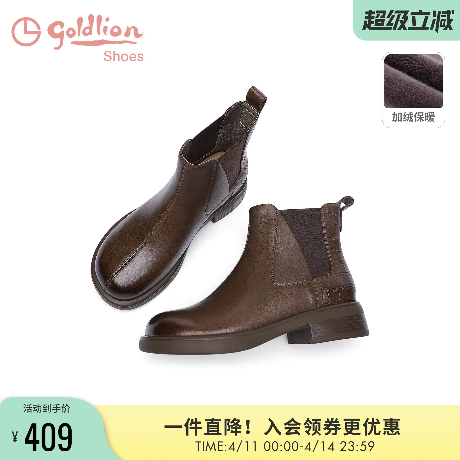金利来女靴商场同款秋冬加绒保暖烟筒靴厚底真皮加绒切尔西短靴女