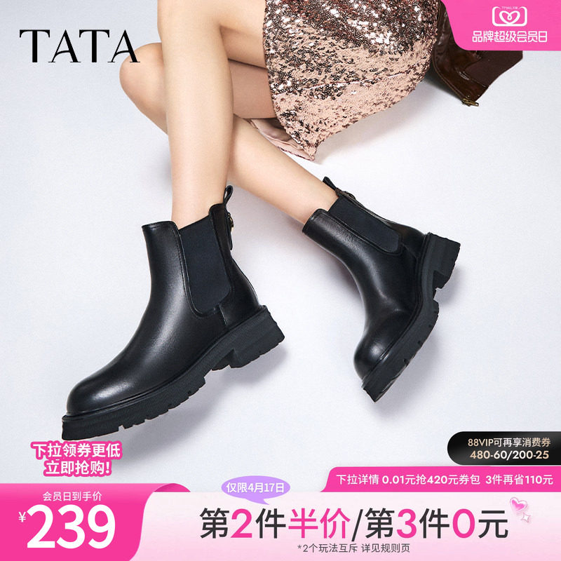 Tata他她气质厚底切尔西靴女靴子加绒真皮烟筒靴短靴冬季WAQA5DD4