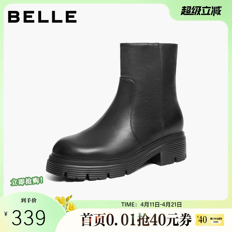 百丽女靴英伦风真皮马丁靴女冬季新款厚底加绒保暖短靴子B9T1DDD4