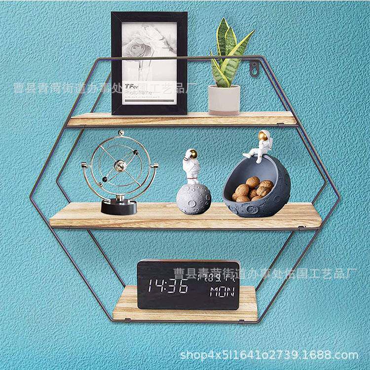 创意墙壁收纳隔板菱形铁艺木质墙上书架置物架 复古实木板壁挂架