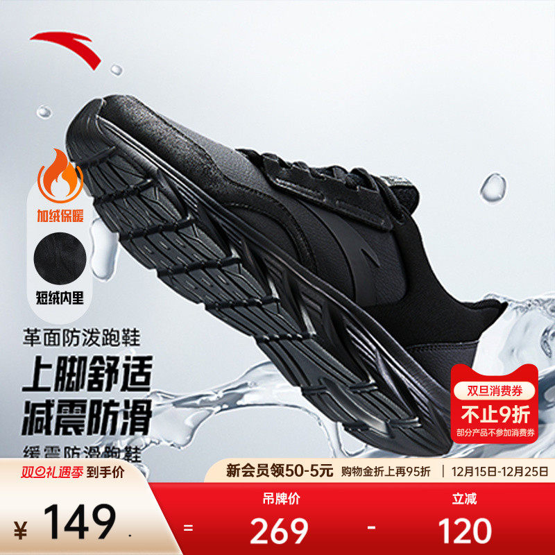 安踏男鞋皮面加绒跑步鞋黑色鞋子冬季减震耐磨跑鞋轻便通勤运动鞋