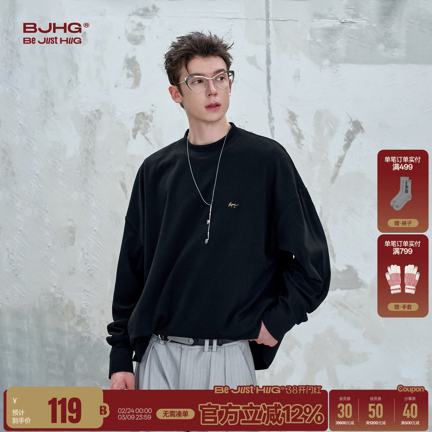 真维斯卫衣男款美式潮牌圆领春秋薄款2026新款休闲百搭男士上衣L