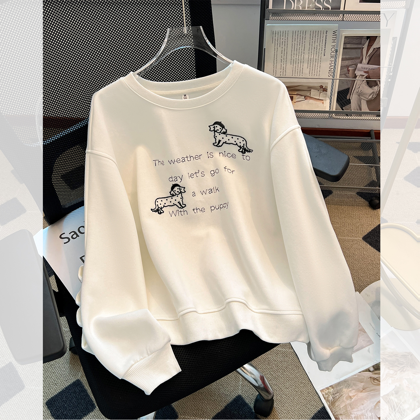 纯白色圆领无帽套头卫衣长袖女2025早秋季新爆款时尚洋气刺绣上衣