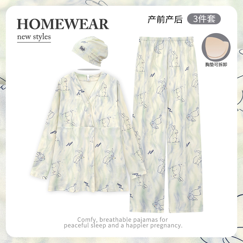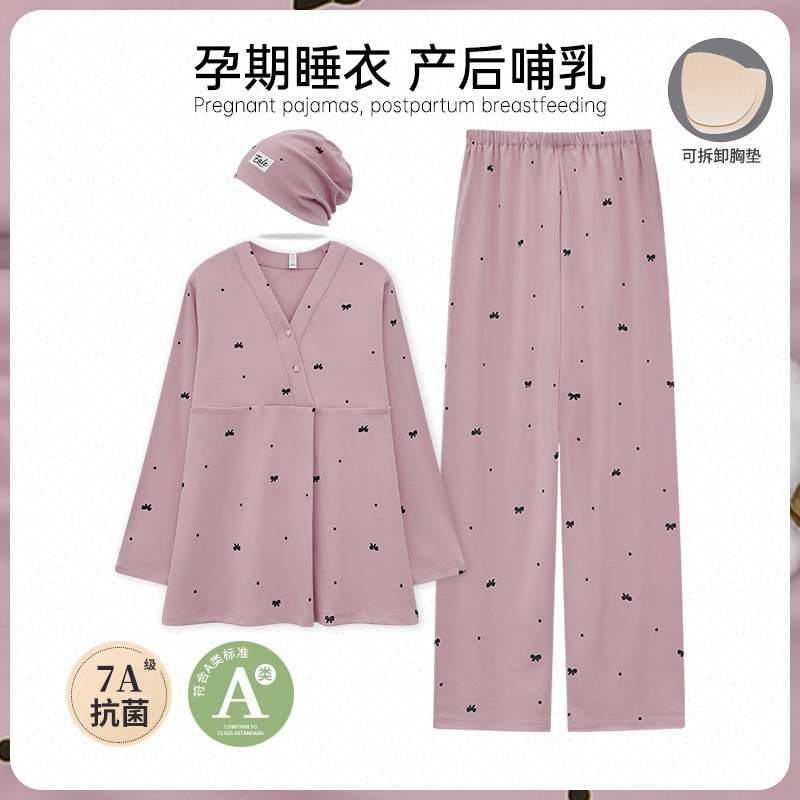 带胸垫月子服春秋纯棉7月份8产后大码孕妇睡衣秋冬款待产哺乳喂奶