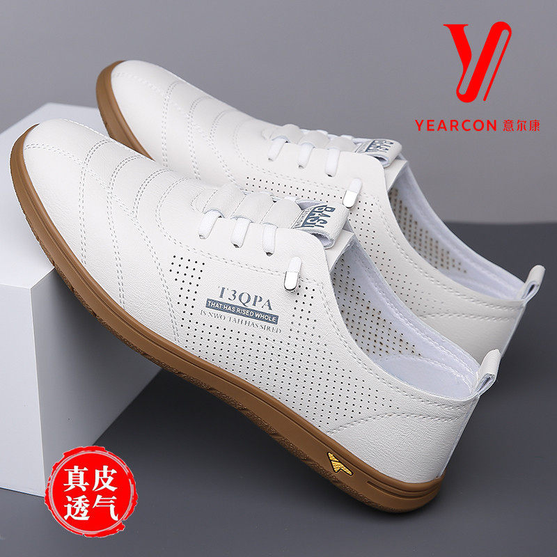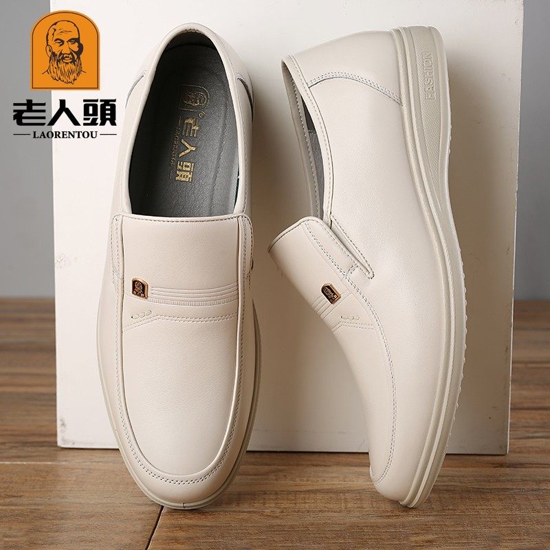 老人头皮鞋男真皮休闲鞋2025春白皮鞋男米白色镂空透气凉皮鞋男