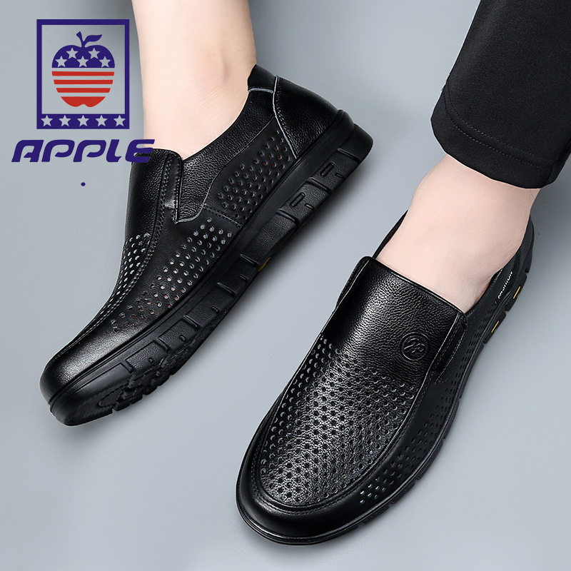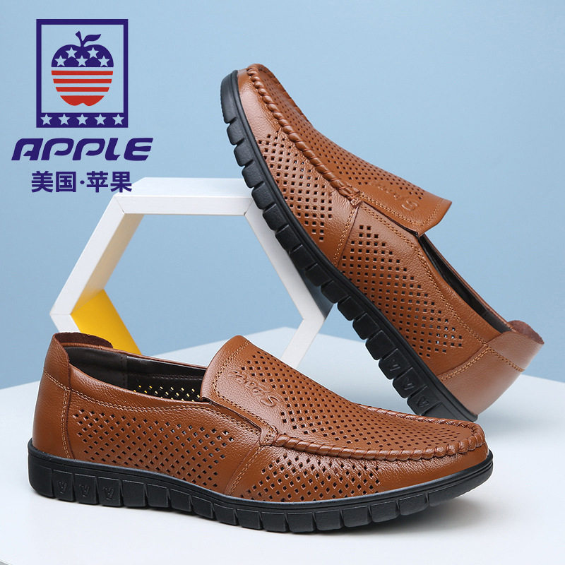 苹果/APPLE夏季镂空透气凉皮鞋男士真皮软底洞洞鞋中老年爸爸鞋