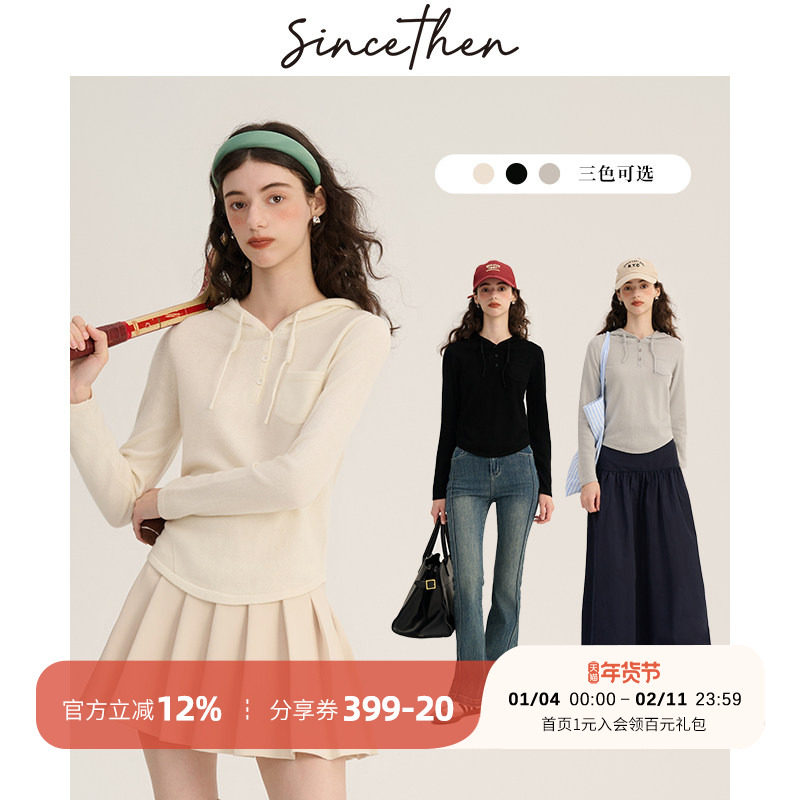 sincethen纯羊毛连帽卫衣薄款套头帽衫学院风打底毛针织衫女秋冬