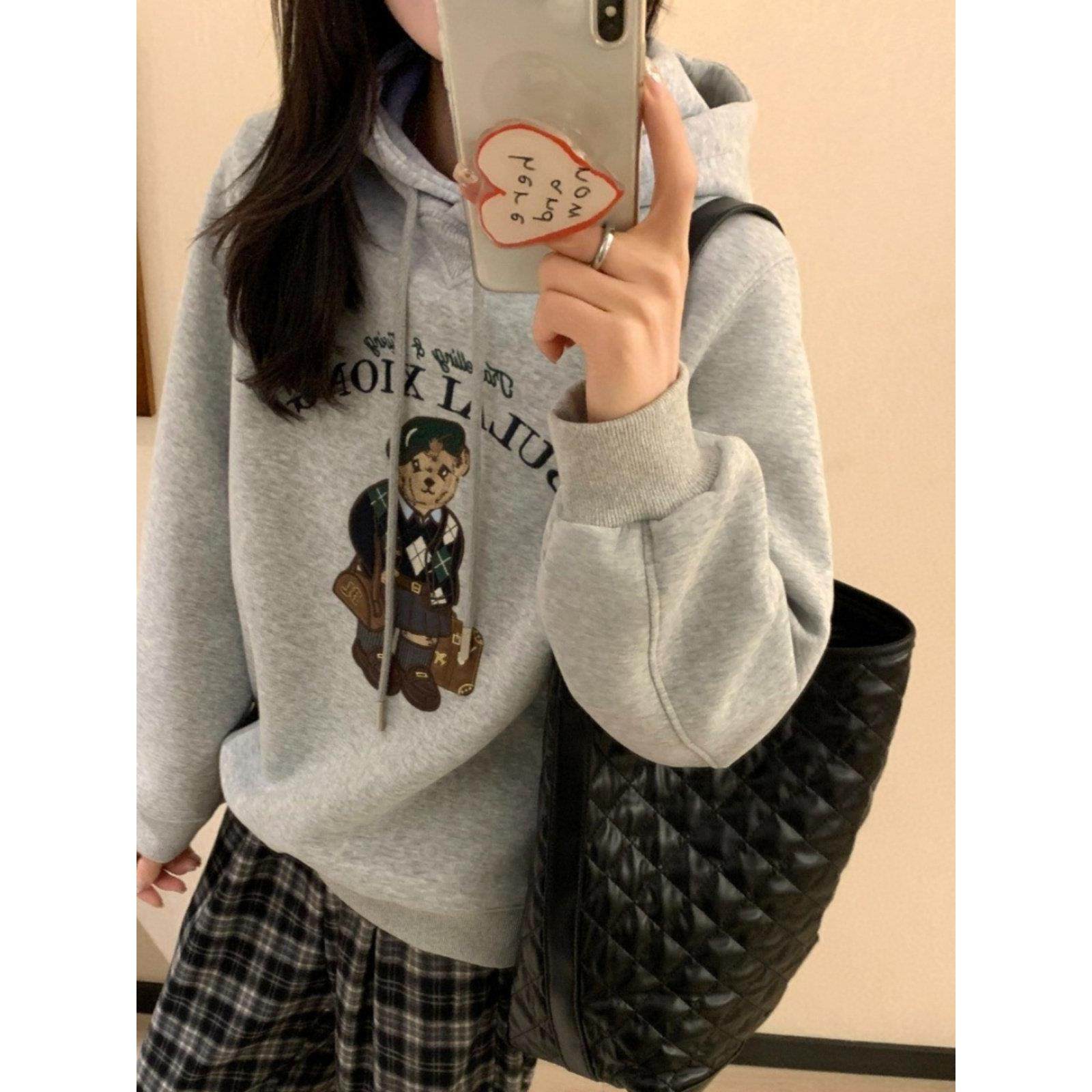 学院风秋冬新款小熊刺绣连帽卫衣女宽松慵懒风套头加绒显瘦外套潮