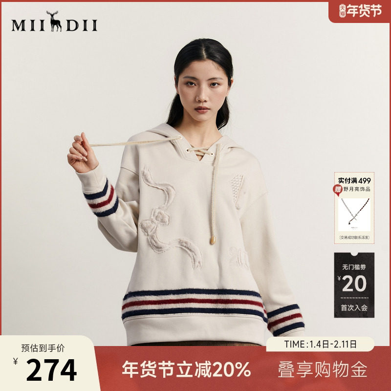 谜底连帽套头卫衣女设计感冬季学院风加厚宽松绣花上衣234MV1557
