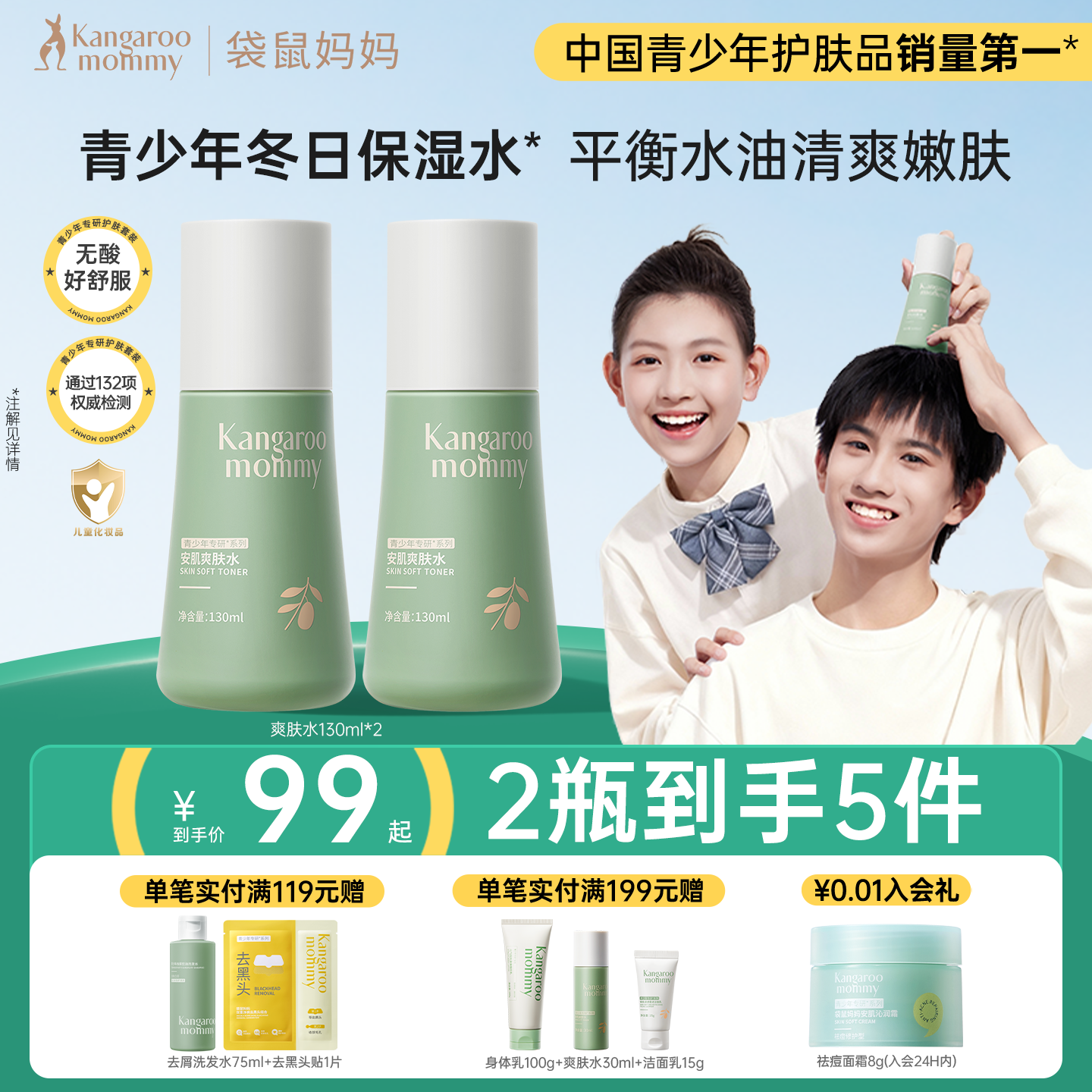 袋鼠妈妈青少年爽肤水儿童保湿补水舒缓男女孩控油抗痘专用护肤品