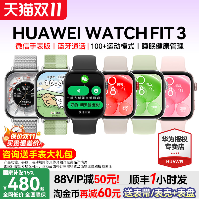 【政府补贴15%】华为手表WATCH FIT3大屏幕智能蓝牙通话心脏健康监测运动防水游泳超长续航官方原装旗舰正品