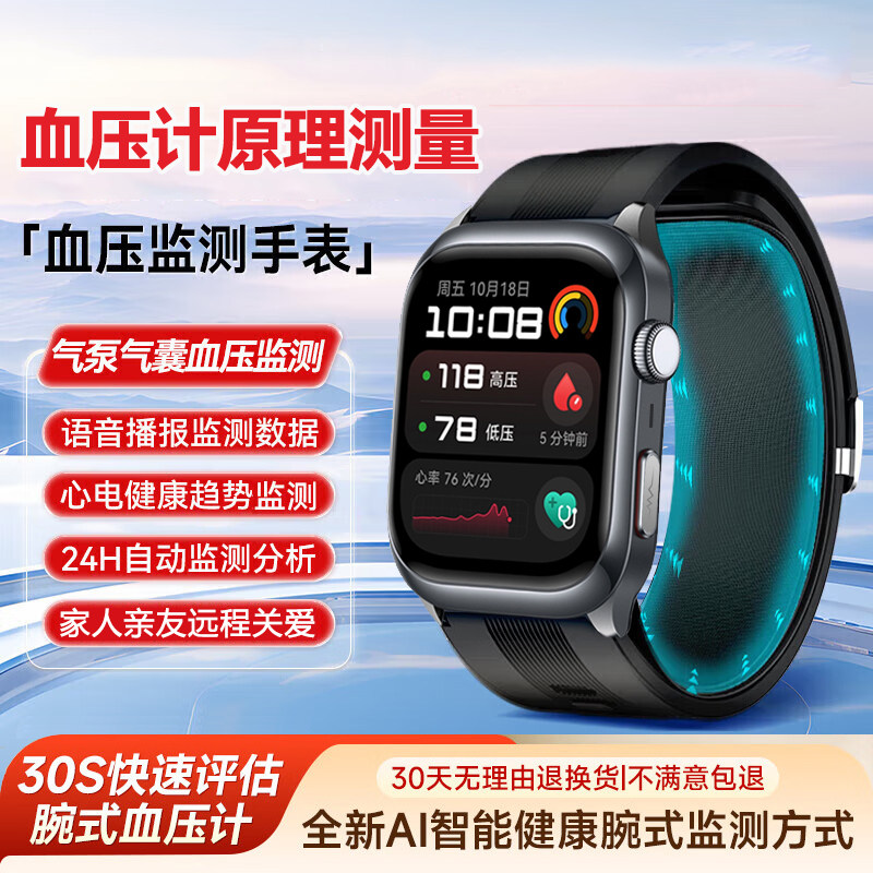 精准血压监测手表气泵式ECG心电图采集血氧心率运动睡眠监测仪老人手环微体检风险评估适用华为苹果小米机