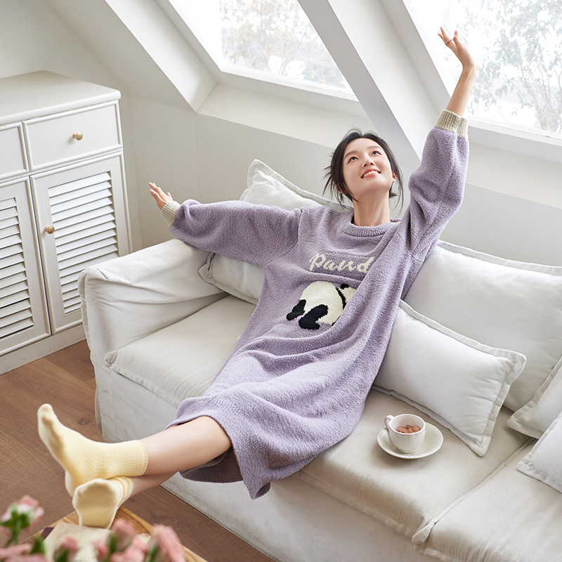 马克公主睡裙女秋冬可爱熊猫加厚加绒睡衣冬天可外穿半边绒家居服