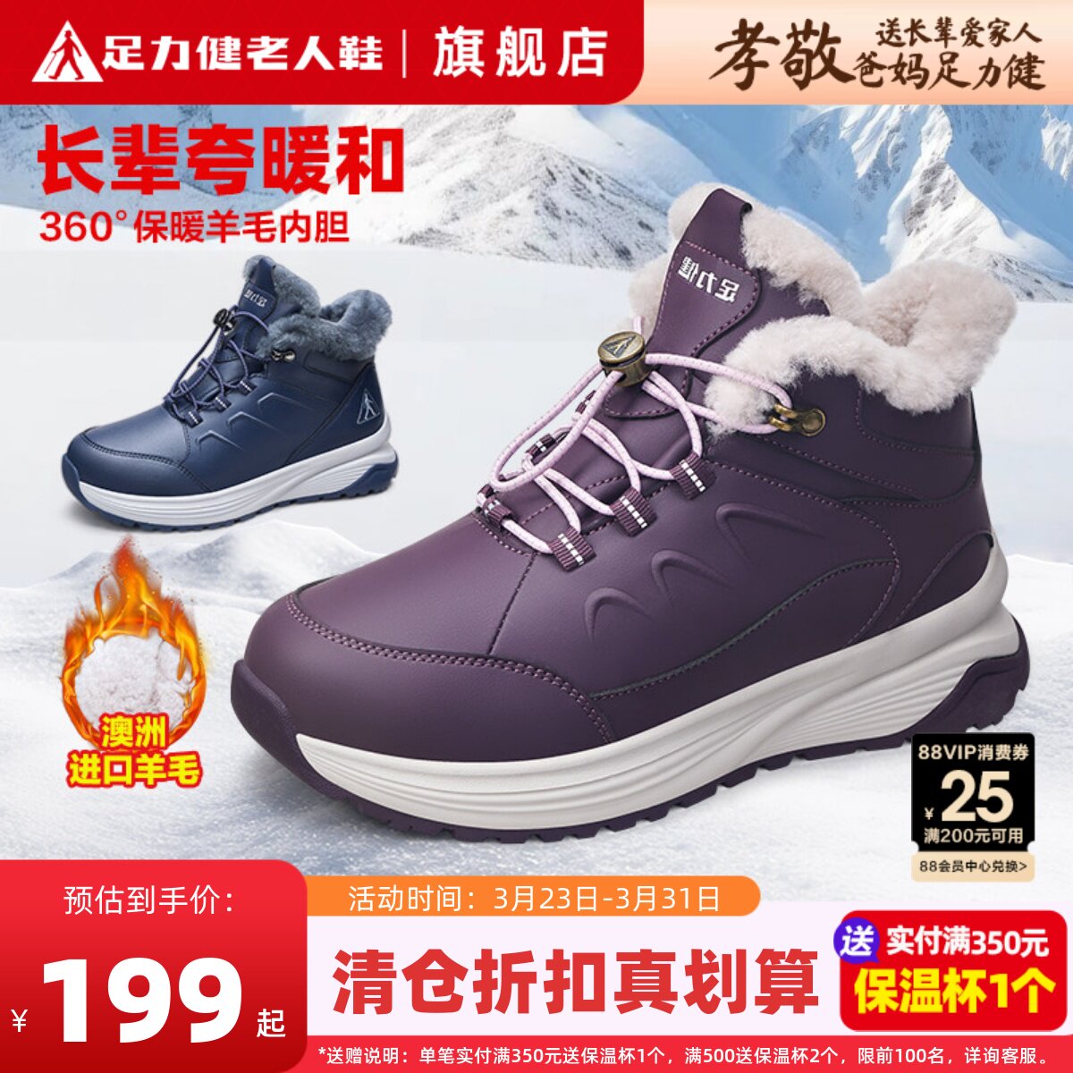 足力健老人鞋正品断码清仓女冬保暖鞋皮毛一体羊毛雪地靴加绒棉鞋