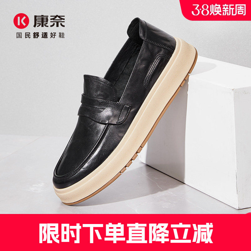 康奈男鞋春复古潮流款乐福鞋一脚蹬休闲皮鞋低帮板鞋厚底真皮单鞋