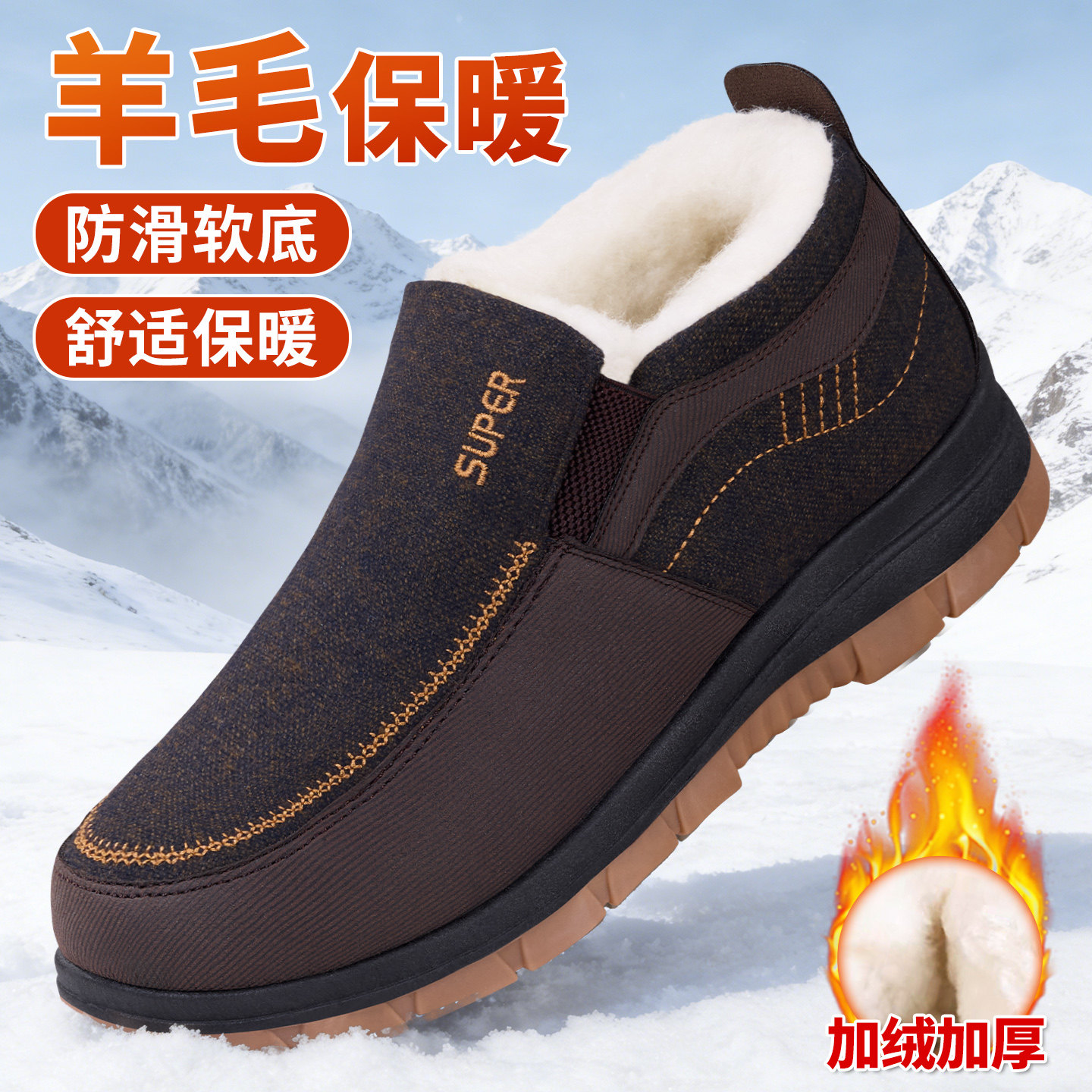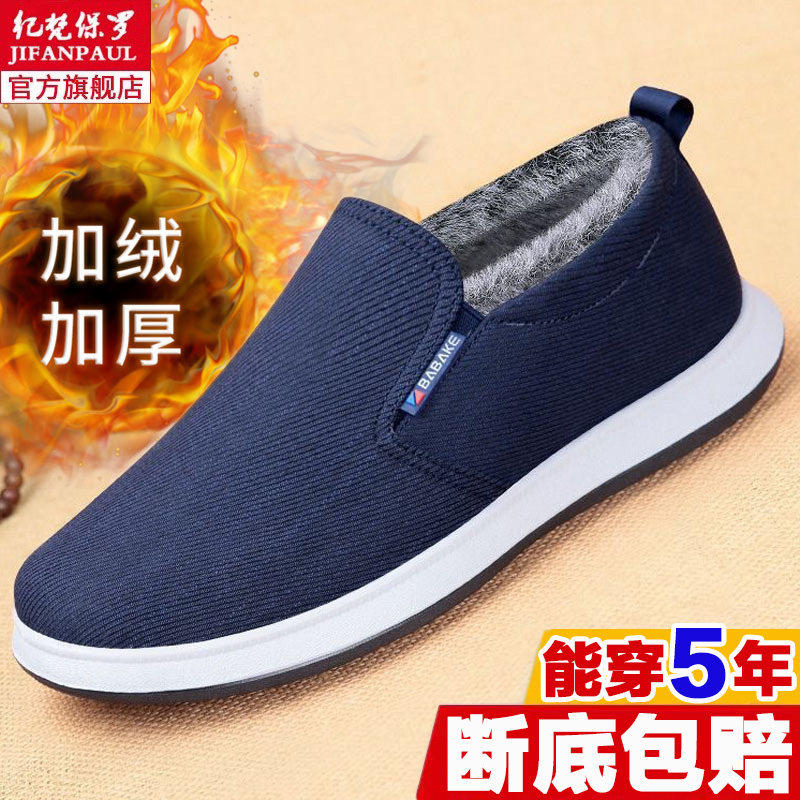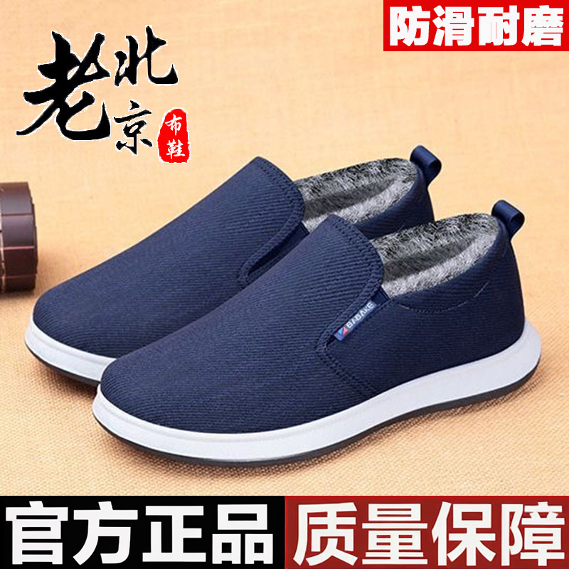 老北京布鞋男冬季加绒新款中老年羊毛保暖防滑一脚蹬软底老人冬鞋