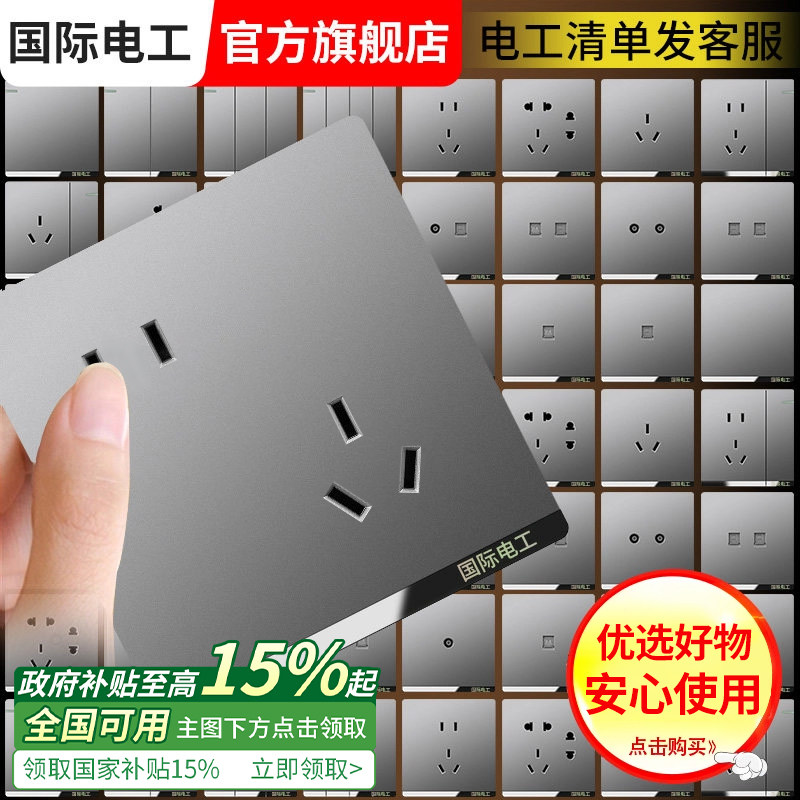 国际电工86型家用墙壁开关插座面板灰色多孔USB暗装一开带5孔五孔