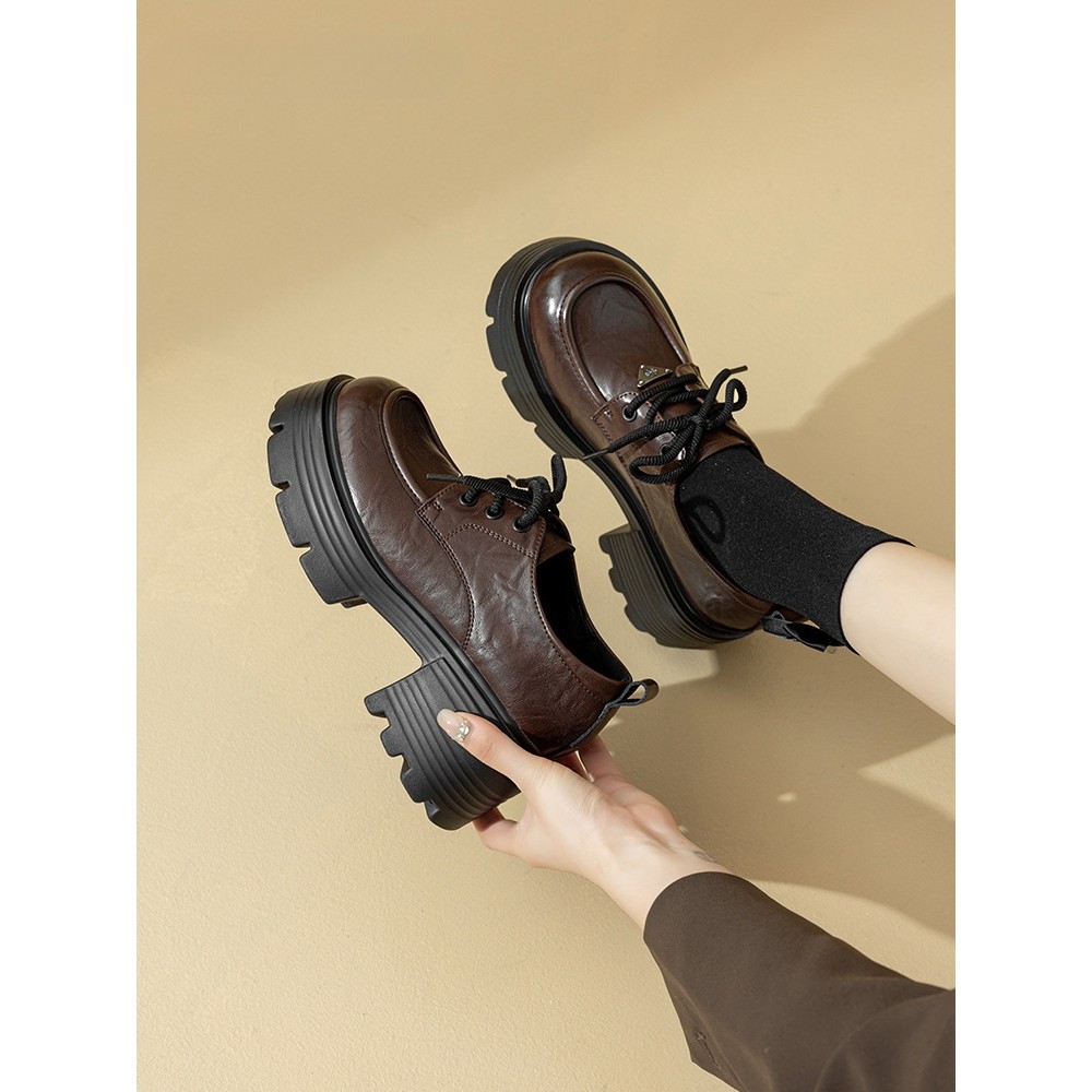 羊皮版~秋冬厚底乐福鞋女2025新款系带单鞋棕色英伦风加绒小皮鞋