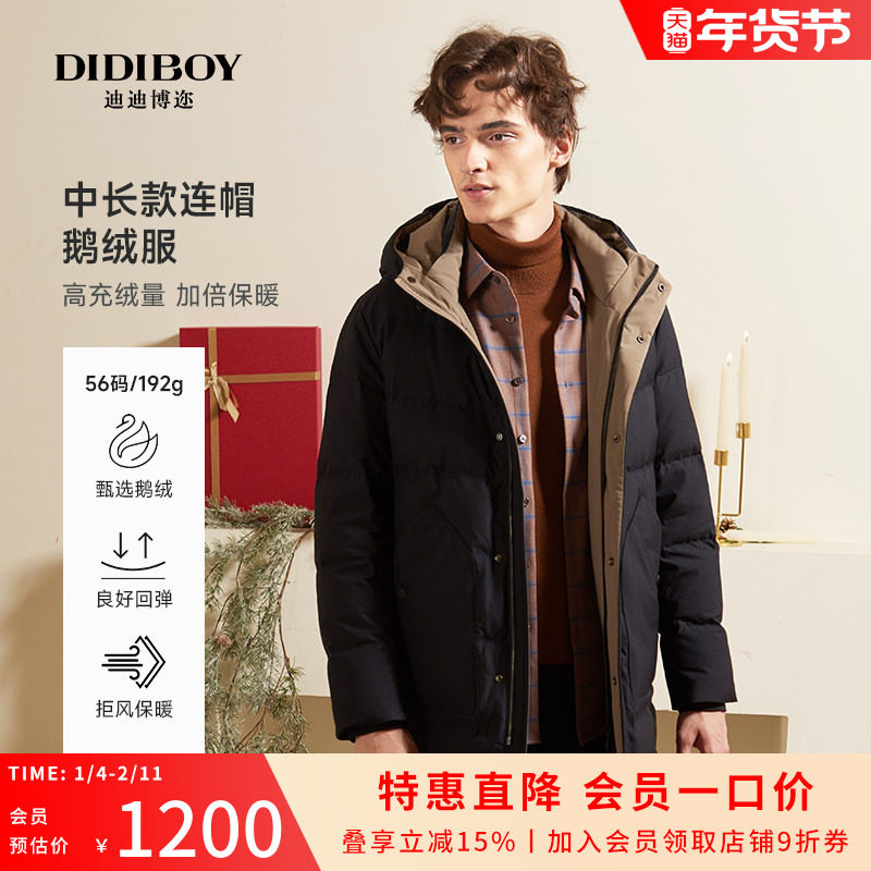 【加厚鹅绒】DIDIBOY中长款男士工装羽绒服连帽冬季保暖男装外套