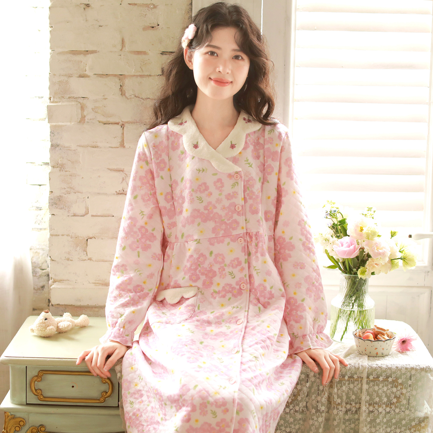 『眠岛』甜美睡裙女士秋冬纯棉加厚保暖浴袍空气层夹棉大码家居服